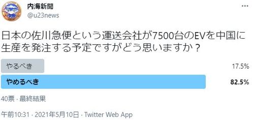 佐川急便が形だけ日本のベンチャーをトンネルに使って中国に運送用EV7500台を発注する話。日本、米英、ロシアに「いい・悪い」を聞いてみたら面白い結果となった。 佐川急便が中国にEV生産を依存することについて まあ、日本国民も圧倒的多数が今回の佐川の…